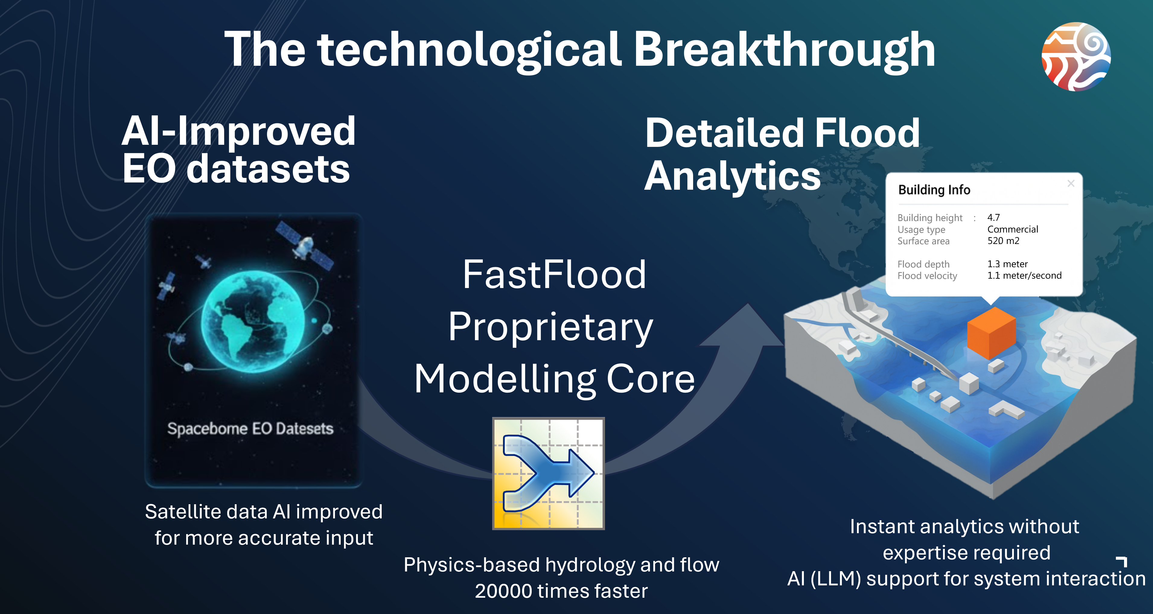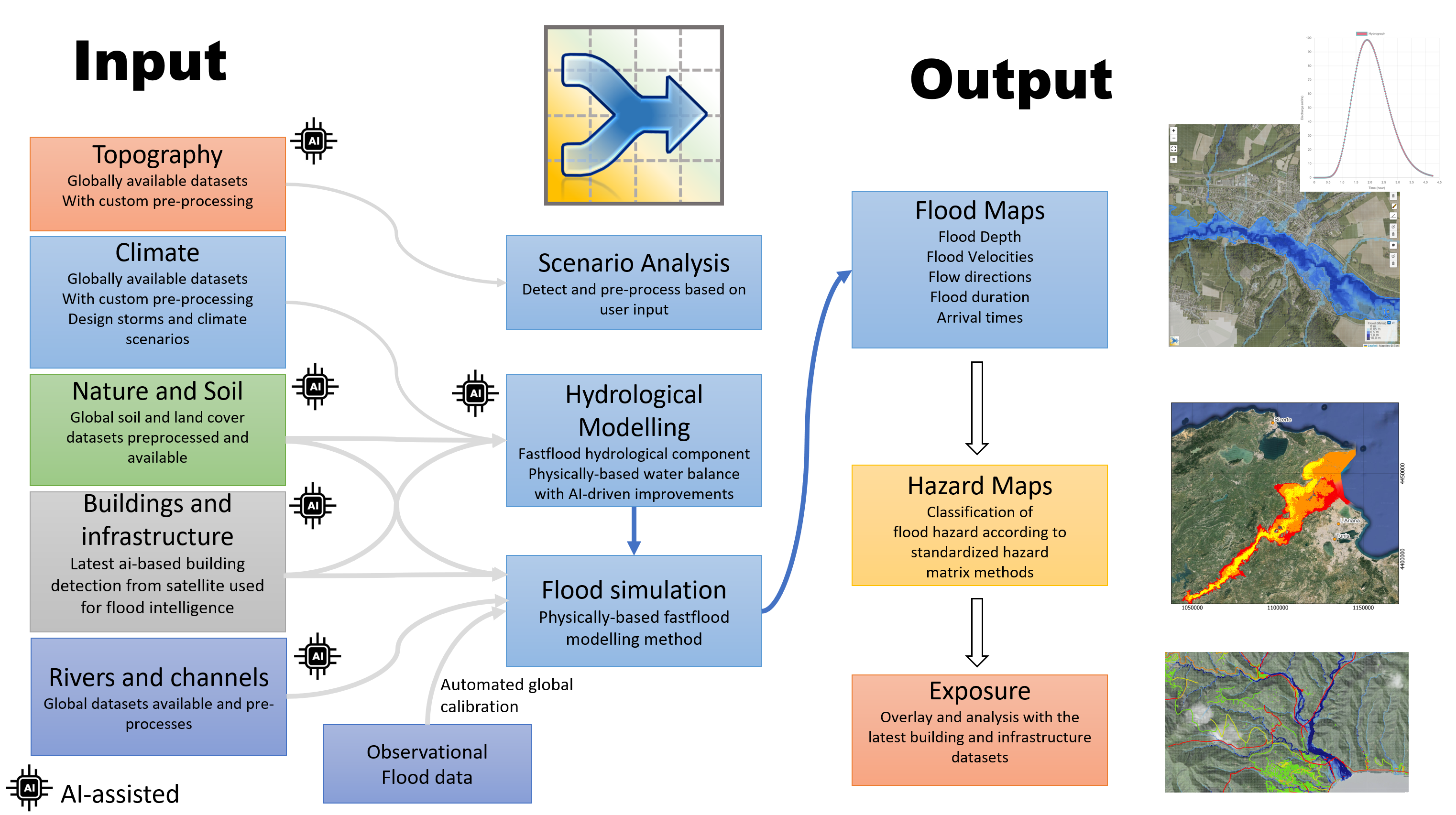 FastFlood provides major breakthroughs in high-quality global datasets. It leverages Earth Observation (EO) data, and global collections of observational data and measurement together with innovations in AI-driven improvements to quality and accuracy.