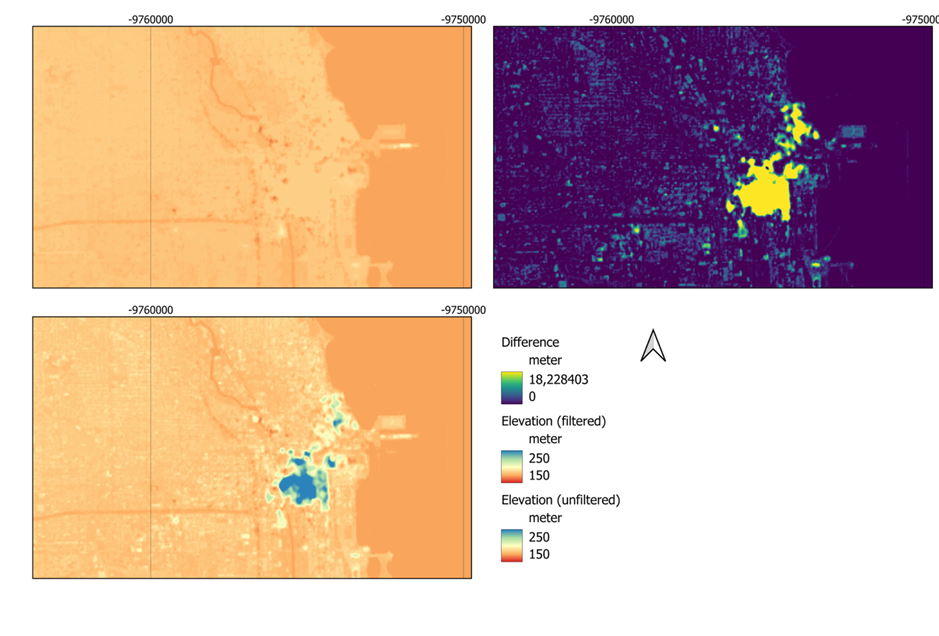 Two examples of the DTM filter built-in into fastflood applied are provided below, with the first example showing the urban center and surroundings of Chicago, USA. The second example shows a smaller rural are in the Netherlands.