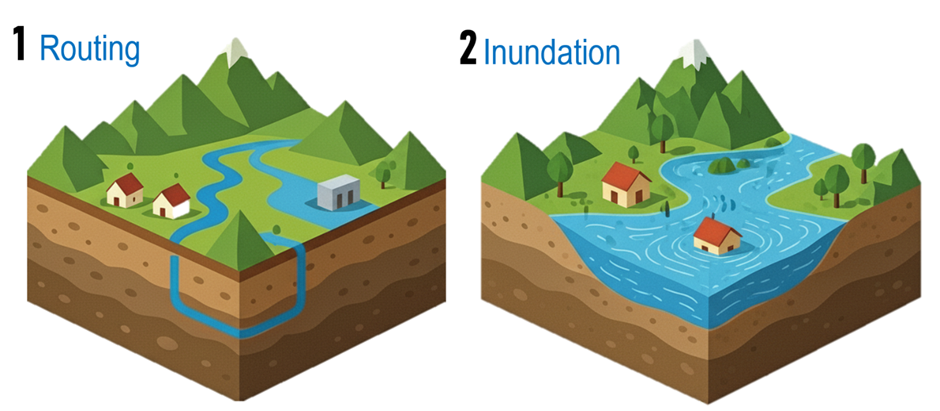 The model first figures out how water moves through rivers and reservoirs in a process called routing. Then, it calculates how that water spreads out over the surrounding land to create the final flood map, a step known as inundation mapping.