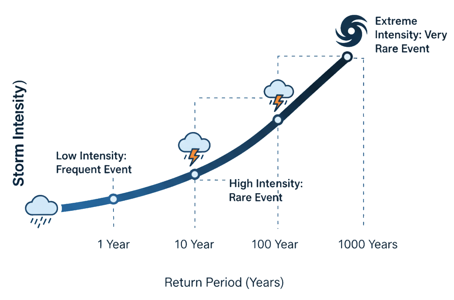 You can test how an area would handle different types of floods by using "design events". These are often described by a "return period," like a 1-in-100-year storm, which represents a very intense storm that has a 1% chance of happening in any given year.