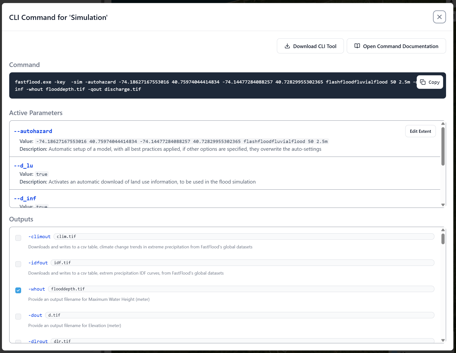 On fastFlood Global, you can quickly grab the CLI Command for any simulation you did,